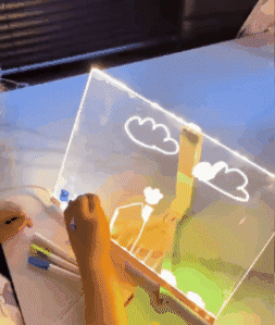 Este tablero ofrece una experiencia visual extraordinaria. Está hecho en acrílico resistente, con una superficie suave y transparente que se ilumina al insertar dibujos con marcadores fluorescentes.